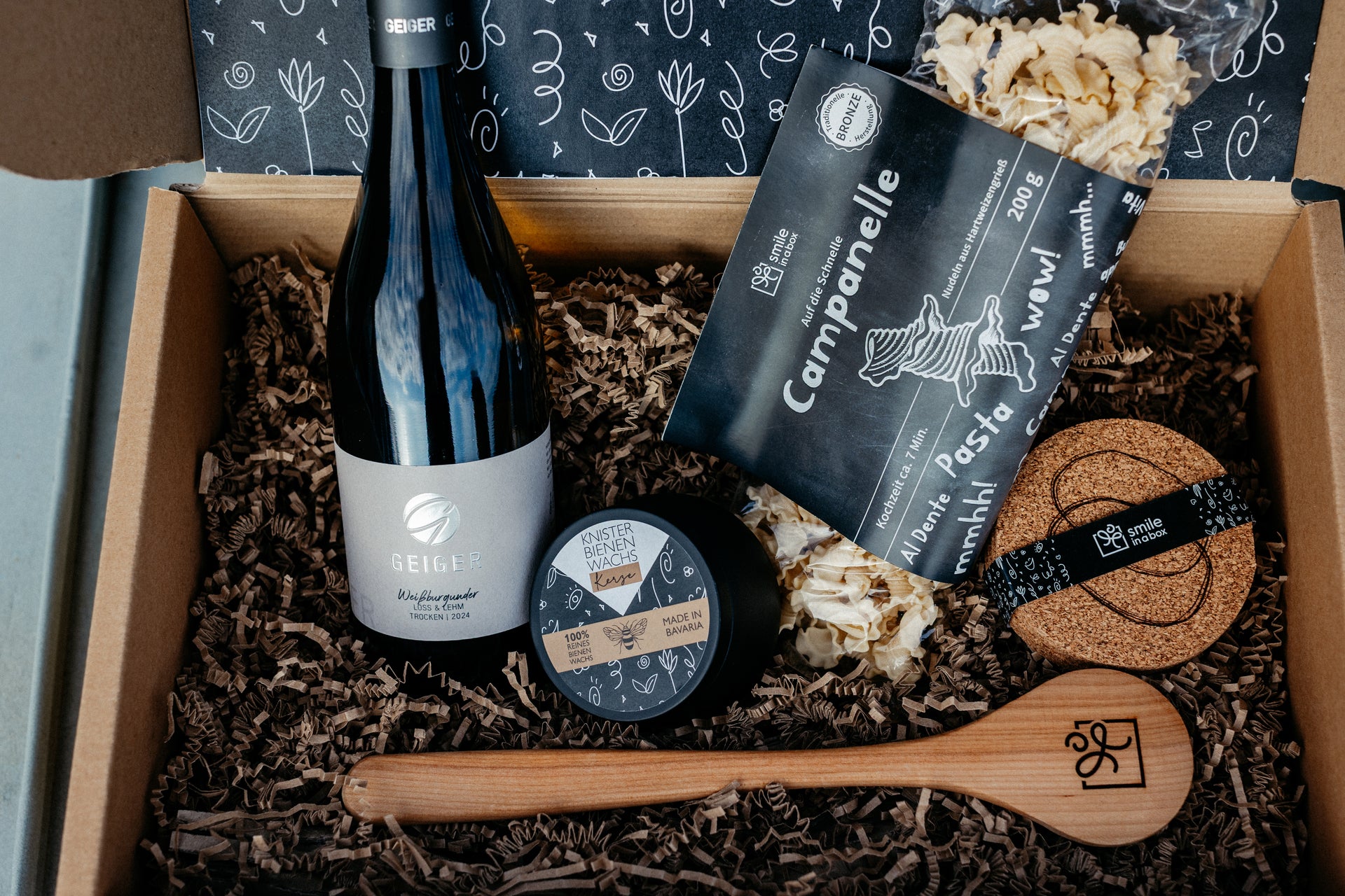 - Zum Lächeln bringen unsere Pakete auch die vielen kleinen Manufakturen, die wir für unsere Geschenksets bevorzugen und Sie mit Ihrem Kauf direkt unterstützen.