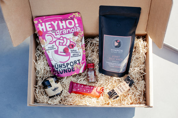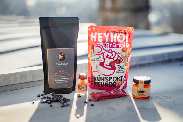 Der kräftige Espresso von Yoanda, aus einer inklusiven Rösterei, küsst wach. Das knusprige Bio-Granola von HeyHo unterstützt soziale Projekte. Der Bio-Honig von Imker Schindler steht für naturnahe Imkerei. Und der Tzampas Goji-Riegel liefert Energie mit ökologischen Zutaten. Mit Ihrem Kauf fördern Sie unmittelbar Inklusionsarbeit – ein Engagement, das die Beschenkten sicher zu schätzen wissen!