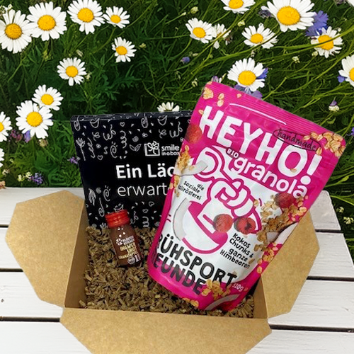 Mit der Box Happy Morning beginnt der Morgen voller Energie und Genuss. Ein belebender Energieshot "Granatapfel-Ingwer" sorgt für den frischen Kick, während das knusprige Bio-Granola von HeyHo mit hochwertigen Zutaten langanhaltend sättigt und einfach gut schmeckt. Die perfekte Kombination für alle, die bewusst, kraftvoll und positiv in den Tag starten möchten. Was sonst könnte man geschätzten Mitarbeitenden und Kunden wünschen?