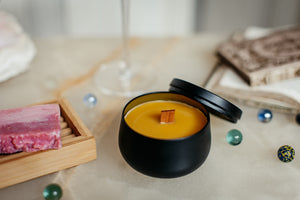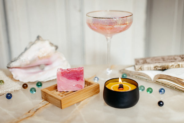 Gönnen Sie Entspannung! Unser kleines Set mit Knisterkerze und wohlduftender Badeseife. Auf Wunsch mit Ihrem Logo auf dem Deckel der Knisterkerze!