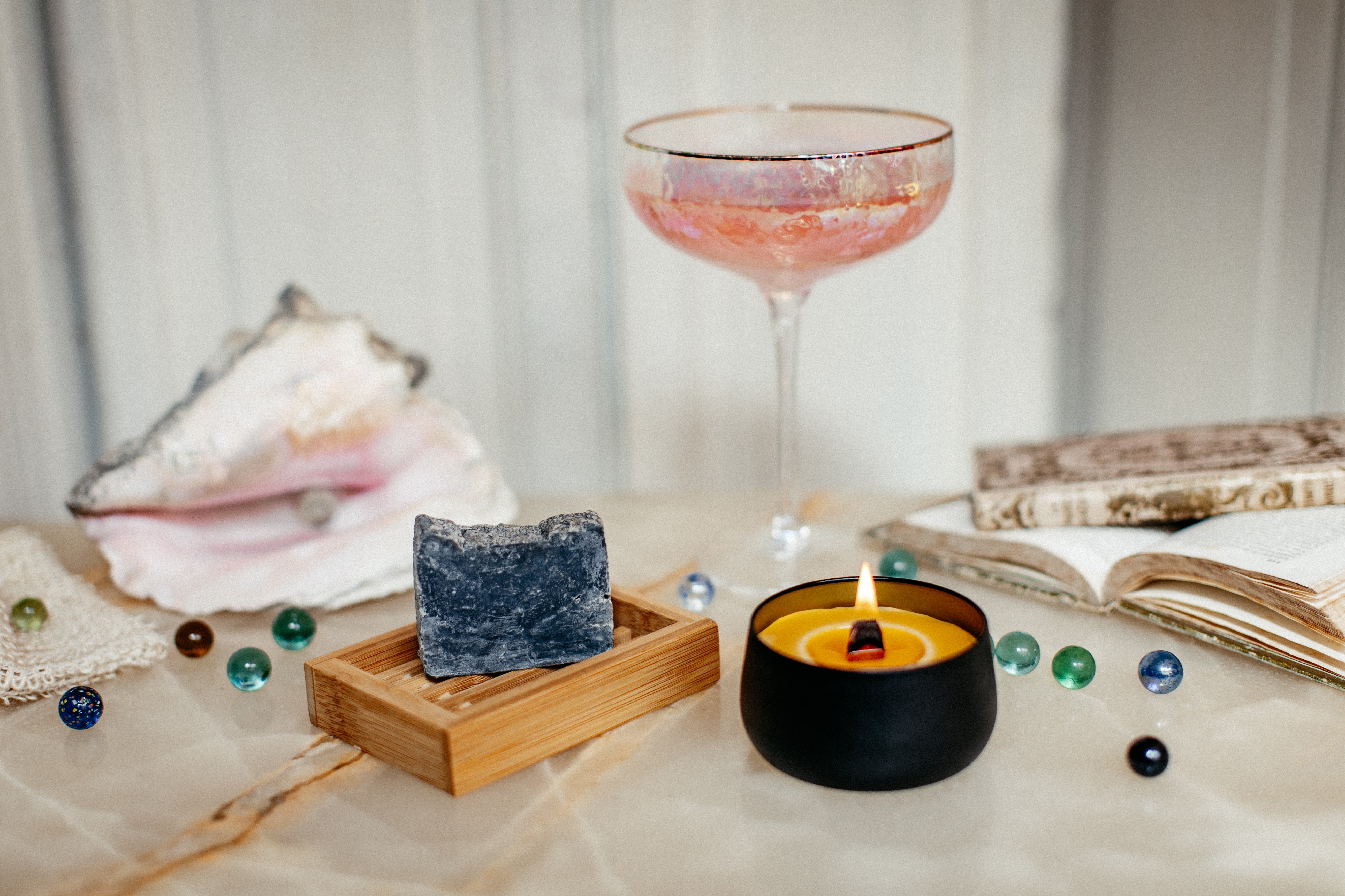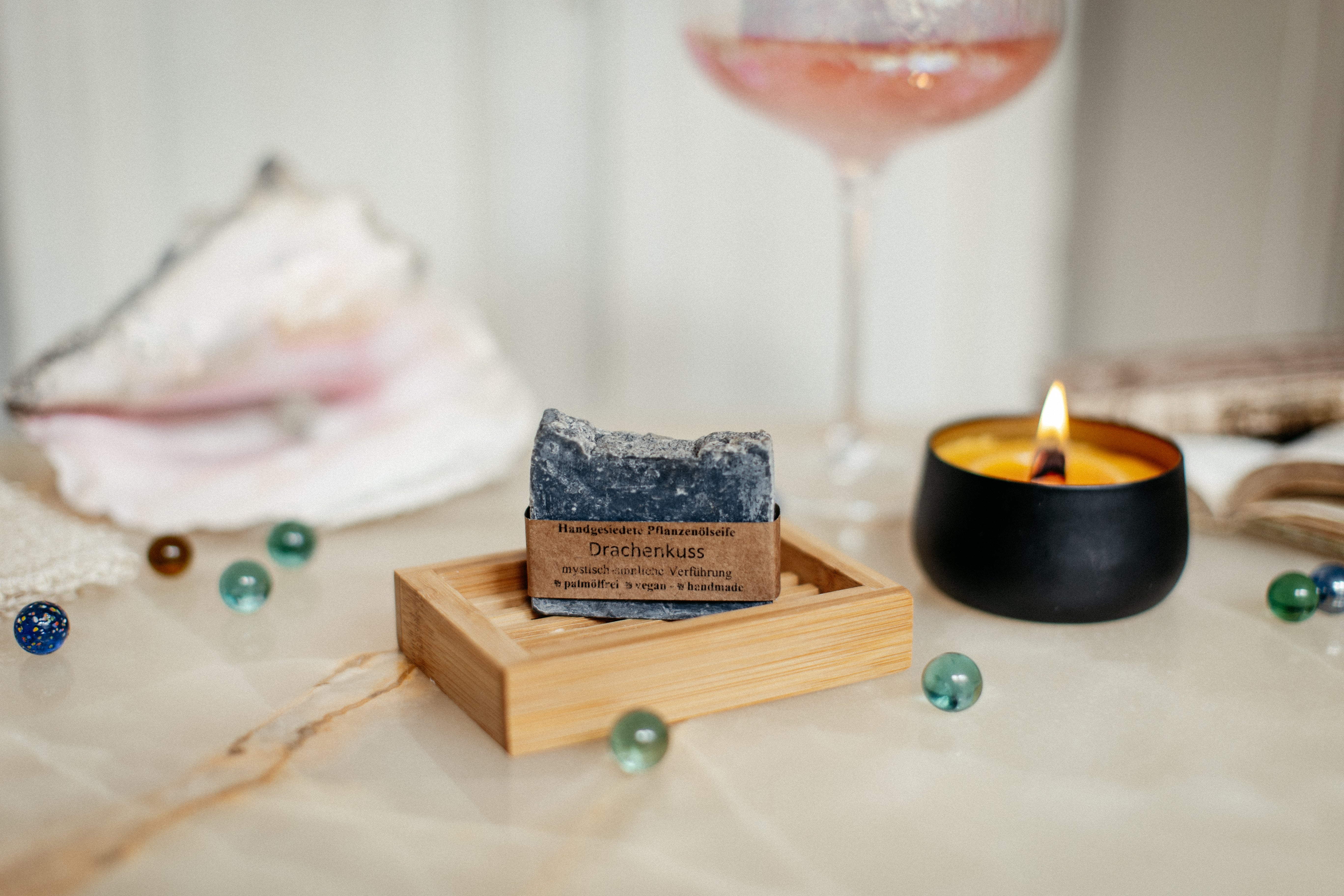 Gönnen Sie Entspannung! Unser kleines Set mit Knisterkerze und wohlduftender Badeseife "Drachenkuss". Auf Wunsch mit Ihrem Logo auf dem Deckel der Knisterkerze!