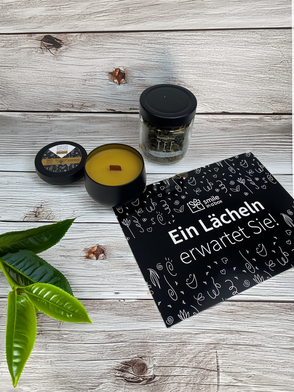 Die kompakte Take Away Geschenkbox vereint zwei besondere Genussmomente: aromatischen Kaktusfeigentee mit seiner fruchtig-milden Note und eine handgefertigte Bienenwachsknisterkerze, deren sanftes Knistern an ein kleines Kaminfeuer erinnert. Perfekt für entspannte Abende, bewusste Pausen oder als besonderes Geschenk für liebe Kollegen oder Kunden.