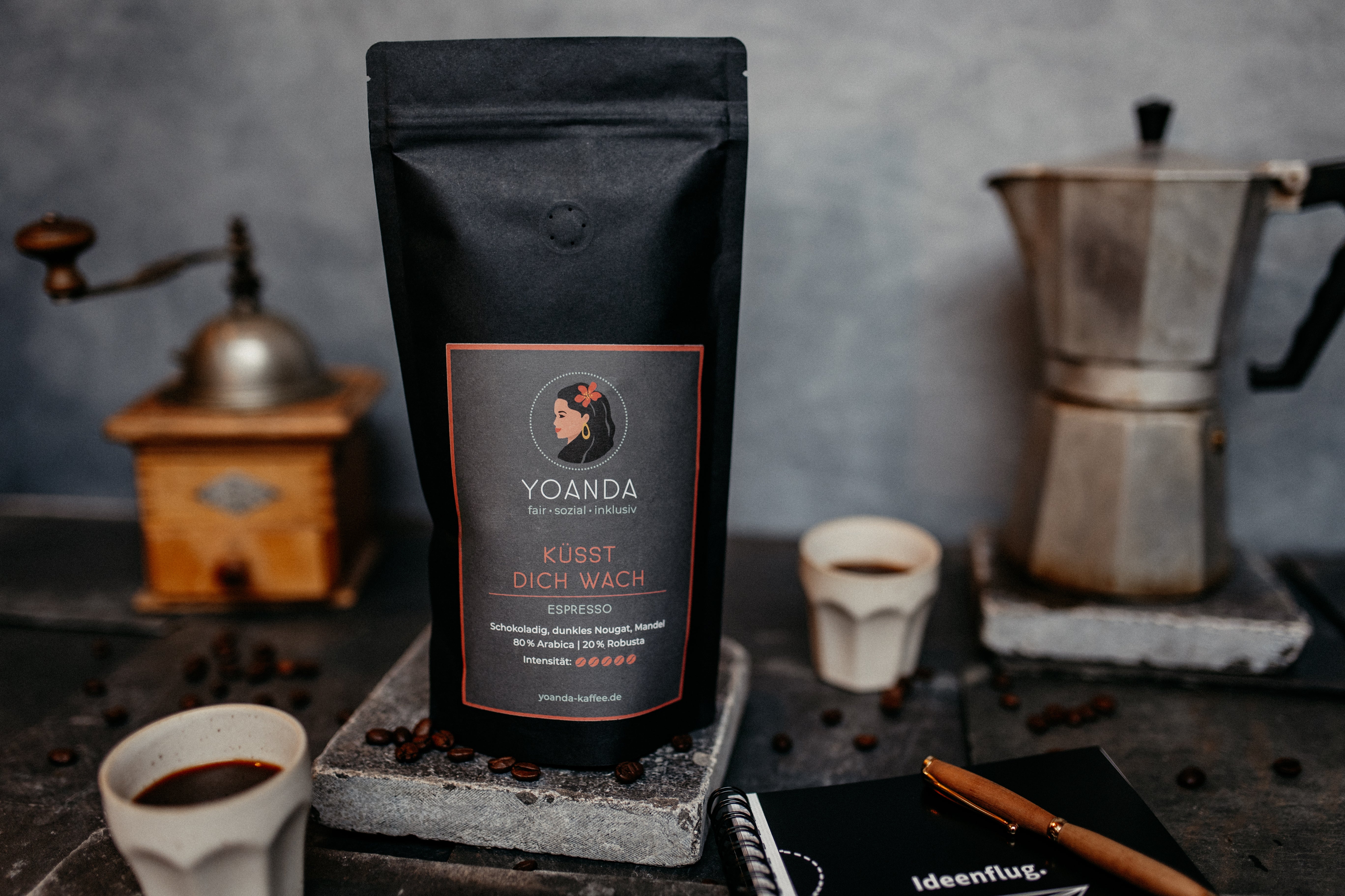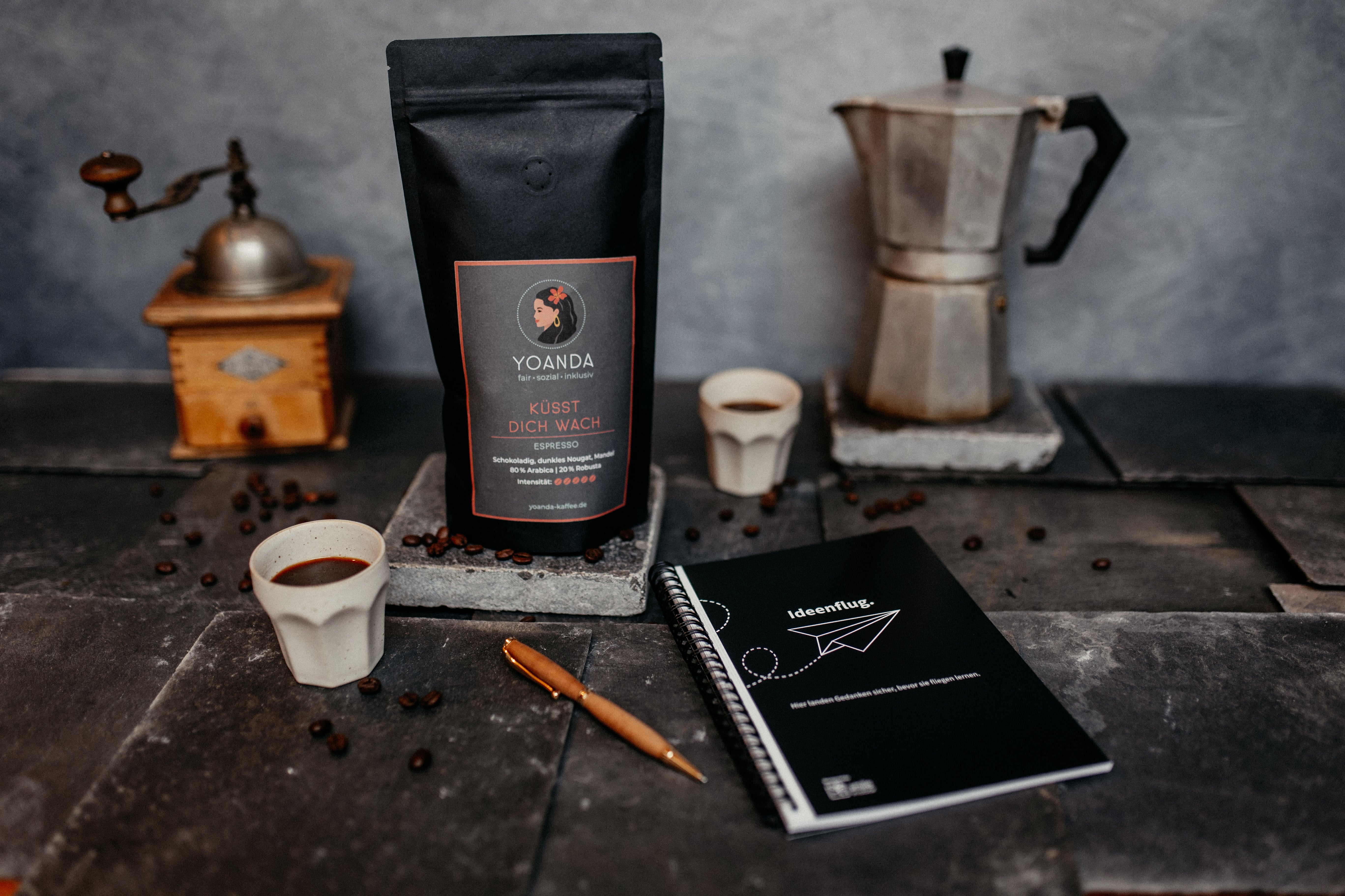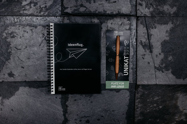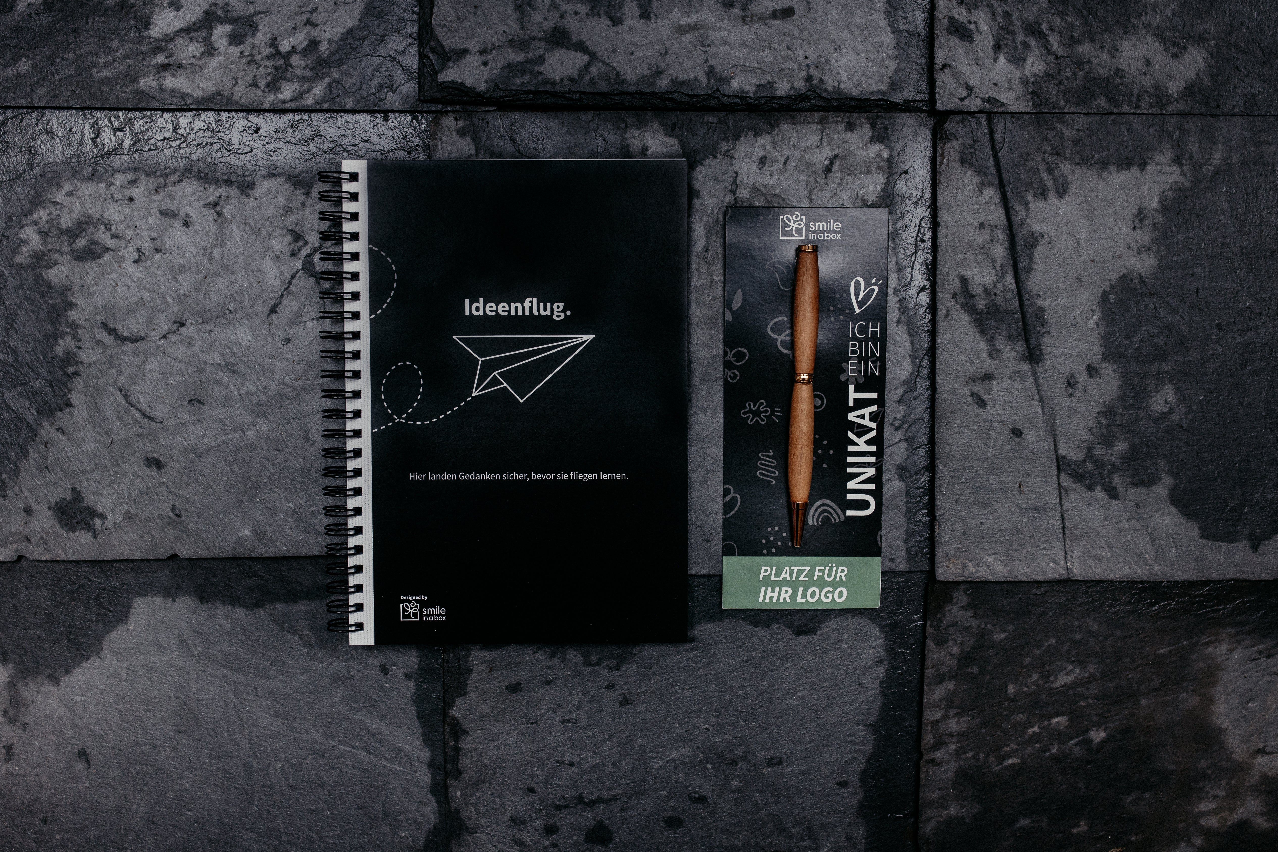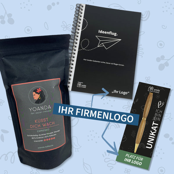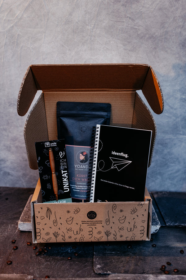 Empfangen Sie neue Mitarbeitende oder einen frisch gewonnenen Neukunden herzlich willkommen! Hier steckt viel Gutes drin. Zum schokoladig, kräftigen Espresso gesellen sich ein formschöner Holzkugelschreiber aus regionalem Holz sowie unser Ideenflug-Notizbuch mit schwarzem Umschlag. Mit diesem Geschenk aggieren Sie nachhaltig, sozial und sinnstiftend - Ihre Beschenkten wissen das zu schätzen.