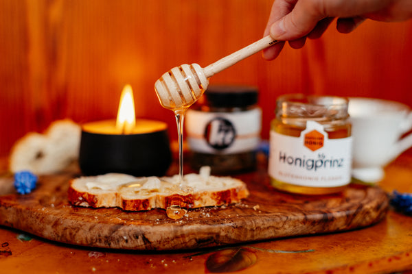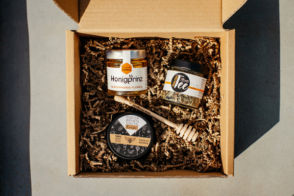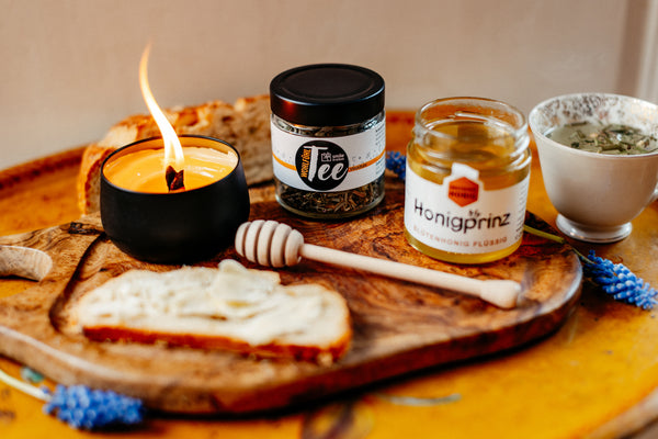 Zum feinen Wohlfühltee gesellt sich unsere wunderschöne Knisterkerze aus Bienenwachs - Handmade in einer kleinen Manufaktur aus Niederbayern. Mit im Set ein deutscher Blütenhonig und ein Honiglöffel aus Holz, den unser Inklusionsbetrieb gerne für Sie individuell graviert. Mit diesem Geschenk aggieren Sie nachhaltig, sozial und sinnstiftend - Ihre Beschenkten freuen sich darüber.